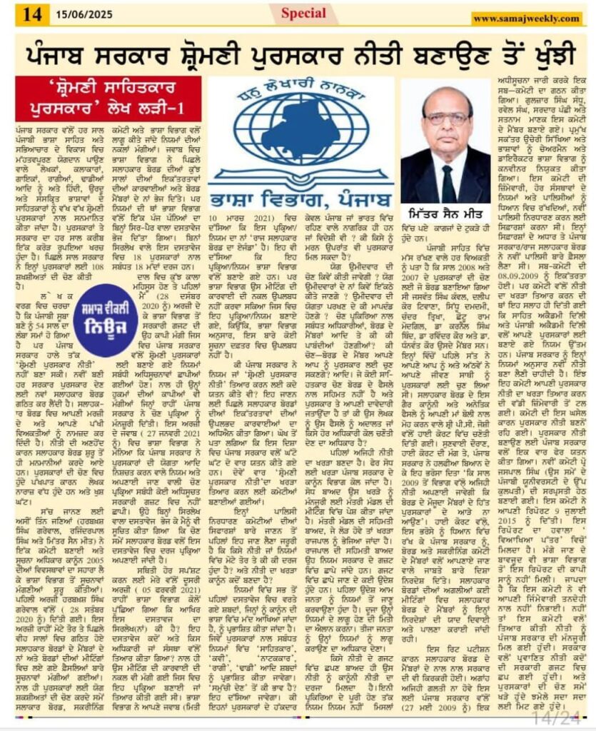 ਪੰਜਾਬ ਸਰਕਾਰ ਸ਼੍ਰੋਮਣੀ ਪੁਰਸਕਾਰ ਨੀਤੀ ਬਣਾਉਣ ਤੋਂ ਖੁੰਝੀ