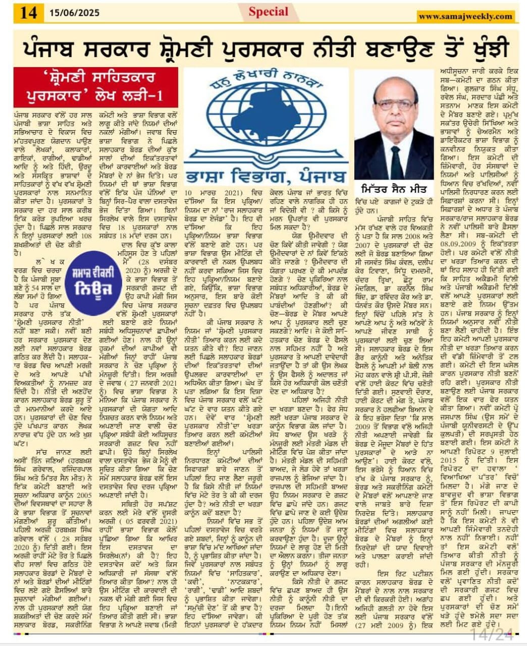 ‘ਸ਼੍ਰੋਮਣੀ ਸਾਹਿਤਕਾਰ ਪੁਰਸਕਾਰ’ ਲੇਖ ਲੜੀ-1