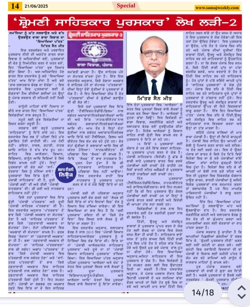 ‘ਸ਼੍ਰੋਮਣੀ ਸਾਹਿਤਕਾਰ ਪੁਰਸਕਾਰ’ ਲੇਖ ਲੜੀ-2